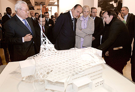 Jacques Chirac observa a maquete do Centro Pompidou durante cerimônia dos 30 anos![]()
